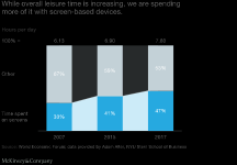 However, this promise may be challenged if our dependence on mobile technology is replicated with AR and VR. Evidence from the past decade shows that while our overall leisure time is increasing, we are spending more of it using screen-based devices (Exhibit 1). Smartphone users interact with their devices an average of 85 times a day, and 46 percent report they could not live without them. Potential overuse leads to other concerns and might also affect the creative economy. Studies have shown how off-screen performance is interrupted by digital devices, and recent research found that just the presence of a smartphone can reduce cognitive capacity. Immersive devices, which could be at least as engaging as smartphones, may end up being inhibiting.