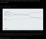 While these technologies have varying potential to change how content is produced and consumed, they are being applied in a dynamic environment. Publishers have used technology to find bigger audiences for their content but have less direct control over how that content is discovered. Instead, technology platforms are the main referral sources for digital publishers, with Facebook and Google responsible for about 70 percent of online referral traffic (Exhibit 2). This relationship is affecting both the editorial elements (what type of content is seen and why) and monetary elements (where the revenue accrues) of information and entertainment content.